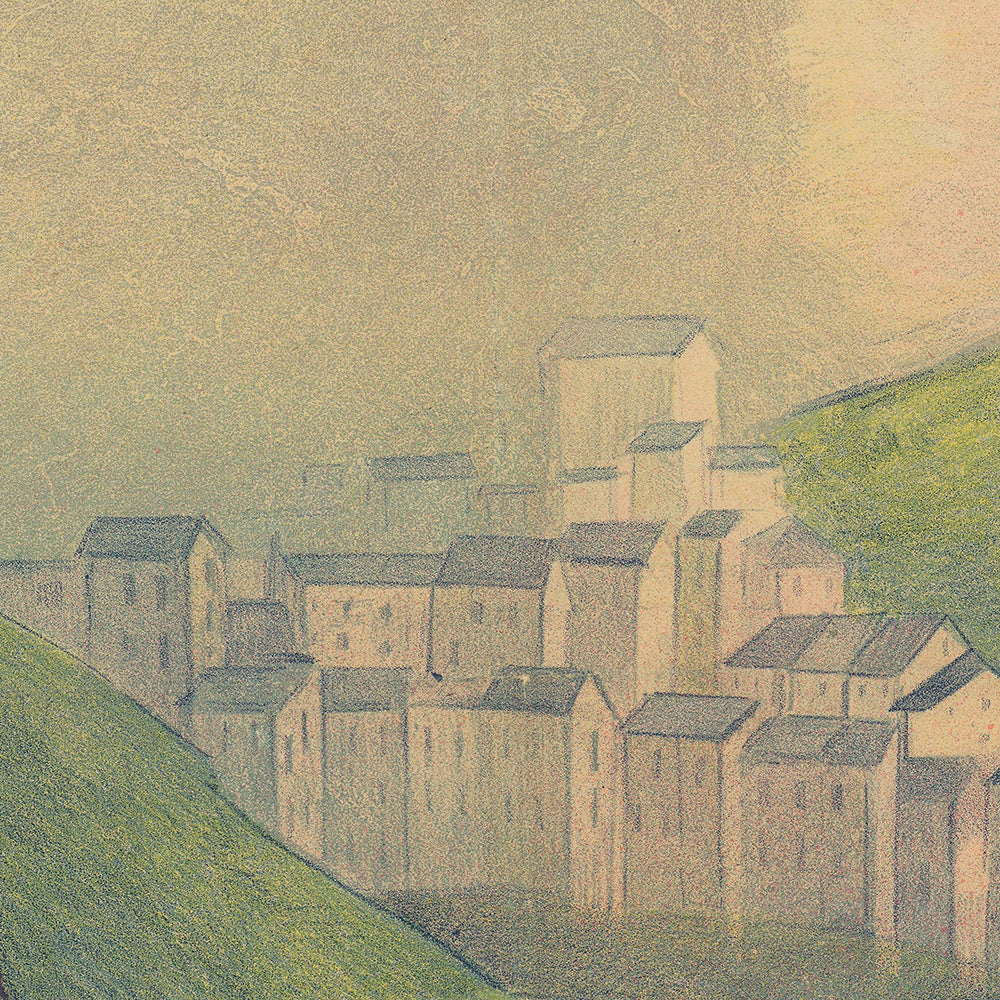 About the art: The palette is a harmony of alpine greens, tobacco browns, and parchment beige, punctuated by the guide’s red sleeve and a spray of stylized flowers along the margin. Soft gradient skies, stippled litho textures, and deep blue shadowing on the yellow title letters give the scene depth and movement. The composition leads the eye from the hiker in the foreground across a winding road to the spa town, then out to the iconic profile of the Ossau peaks—an irresistible invitation to travel. As a print, it brings instant character to interiors, especially rooms with natural wood, stone, or mid‑century accents.