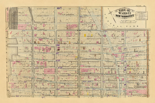 This exquisite 1879 map captures a slice of New York City history, detailing part of Ward 22, now the northern part of Hells Kitchen, with a precision that allows viewers to step back in time. Each block is meticulously hand-colored, distinguishing itself from its neighbors, and every building is represented, suggesting the dense urban environment of this period. The map is a testament to the cartographic skill of G.W. Bromley, known for producing some of the most detailed city atlases of the era.