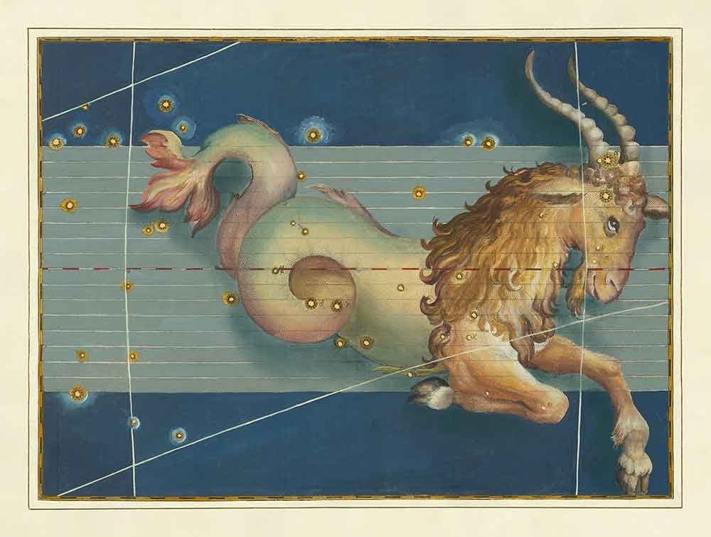 A stunning and exceptionally rare handcoloured celestial chart of the zodiac constellation Capricorn, with all of the stars picked out in gold.