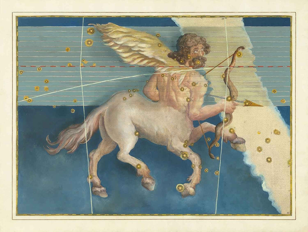 A stunning and exceptionally rare handcoloured celestial chart of the zodiac constellation Sagittarius, The Centaur with all of the stars picked out in gold.