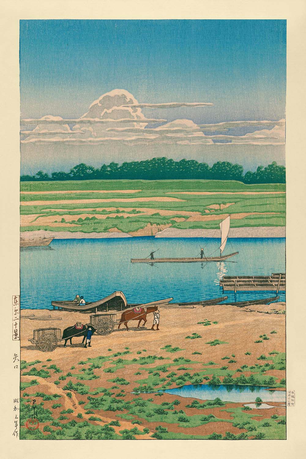 Born in Tokyo in the 1880s, Hasui Kawase became renowned for his landscape prints and modern renditions of traditional Japanese ukiyo-e techniques. His meticulous artistry and emotional depth in depicting seasonal transitions and rural vignettes earned him international acclaim. "River Sailboat and Horses" distinguishes itself through its masterful juxtaposition of tranquil natural environments against manmade engagements, a hallmark of Kawase's portfolio.