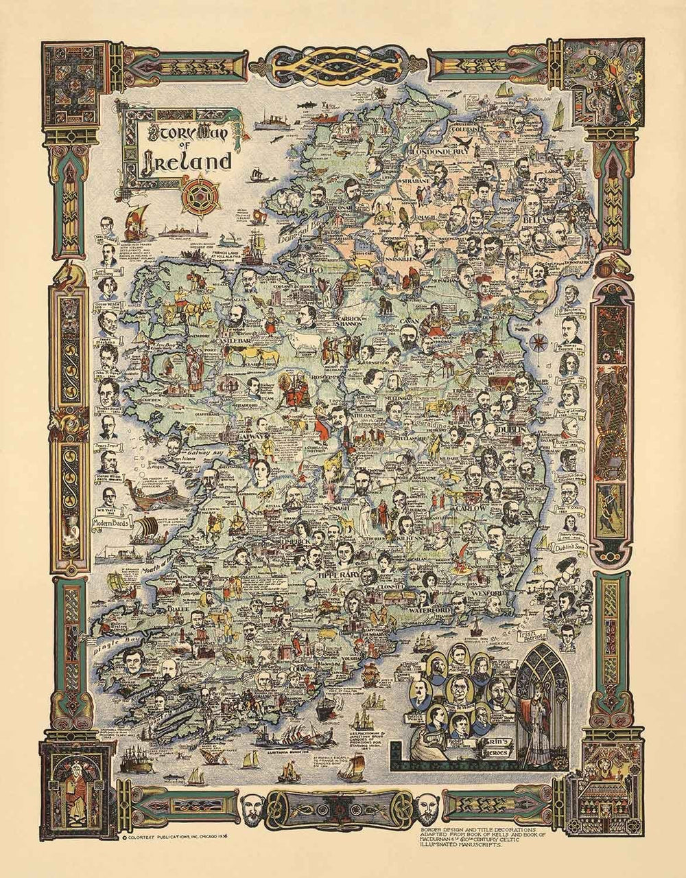 A fascinating and very unique map of Ireland, featuring hundreds of illustrations of historical figures, writers, ships, boats, buildings, etc. It was originally published in 1936, and to be honest I've never seen anything like this before.
