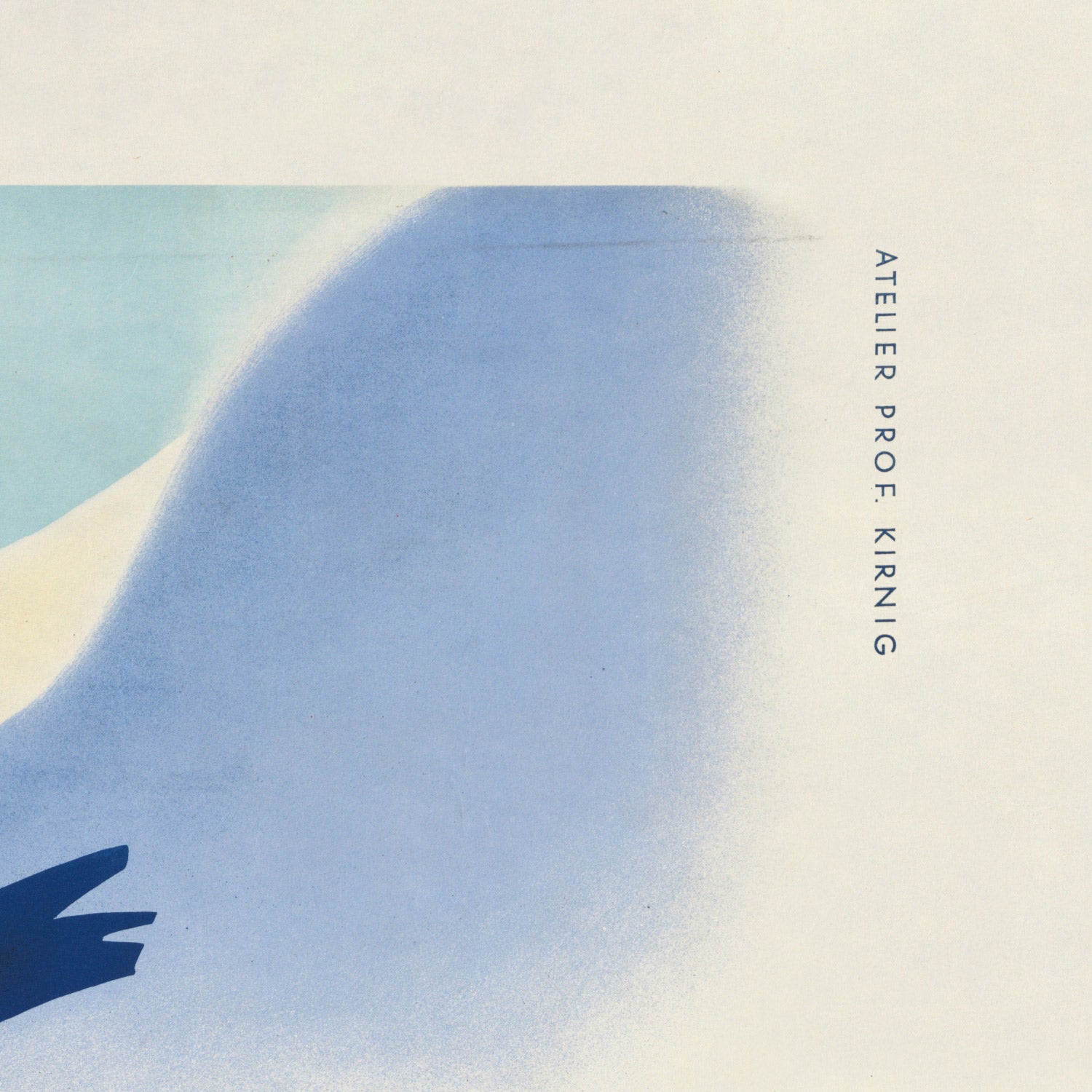 This Austria poster is among his most memorable travel designs. Commissioned for national tourism promotion, it positions winter sport as the country’s calling card, a message that still resonates today for those who’ve skied or dreamed of skiing the Austrian Alps. The diagonal thrust of the figure, the long, clean arc of the ski pole, and the immense white field create a palpable feeling of speed and alpine air.
