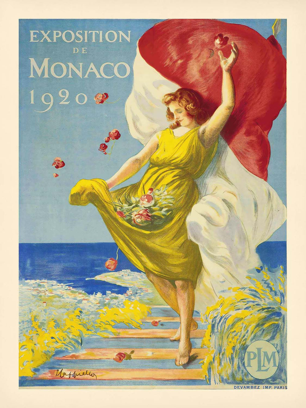 The 1920 Exposition of Monaco represented a spirited return to culture and travel in the post-war years, and Cappiello’s image channels that optimism. The heroine—an archetype of modern beauty—moves with buoyant grace, her armful of flowers symbolising growth, renewal, and the sensory pleasures of the Riviera. Behind her, the tranquil sea and terraced landscape evoke the principality’s singular geography, a meeting of cliff and harbour that became synonymous with refined leisure, concerts, gardens, and seaside promenades.