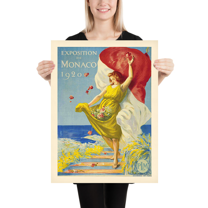 Exposition De Monaco by Leonetto Cappiello (1920) captures the Riviera’s golden promise at the dawn of modern leisure. Designed for the 1920 Exposition of Monaco, this luminous Art Nouveau travel poster presents a radiant figure scattering blossoms above the cobalt sweep of the Mediterranean, with the principality’s sunlit shoreline beyond. Cappiello translates the glamour of Monaco—its cliffside gardens, sea air, and cultured revelry—into a single, irresistible emblem of escape and elegance.