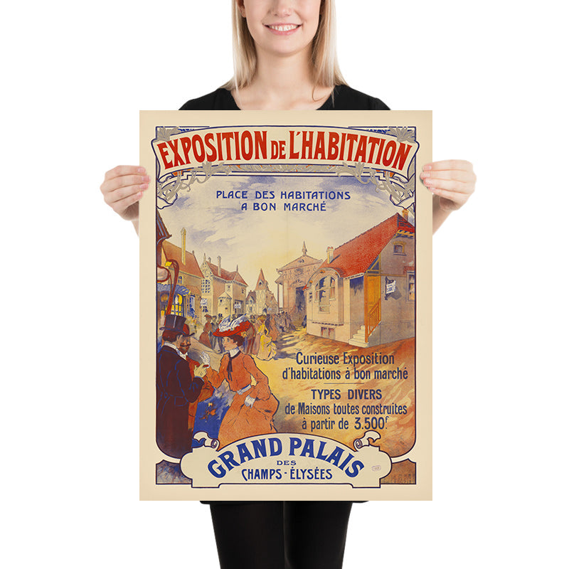 This poster’s subject is unusually compelling: a “curious exhibition of low-cost homes” presented with wit and warmth. In the early 1900s, Paris was grappling with questions of urban growth, hygiene, and access to dignified housing; exhibitions like this brought design innovation to the public. The artwork celebrates architectural variety—cottages, compact townhouses, and inventive façades—while depicting convivial crowds exploring the possibilities. It’s a rare piece of visual culture that marries social reform with showmanship, making it especially meaningful for lovers of architecture, planning, and Parisian history.