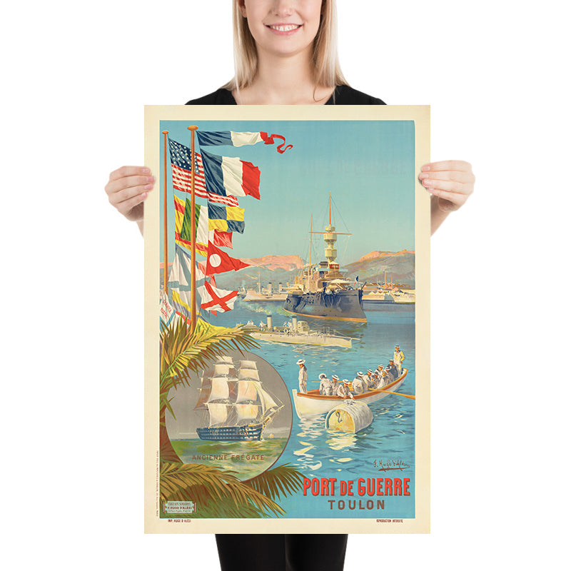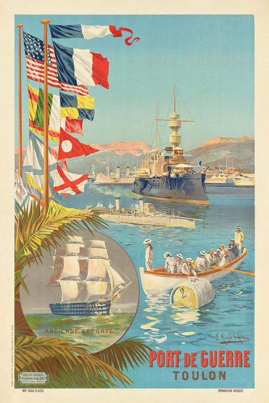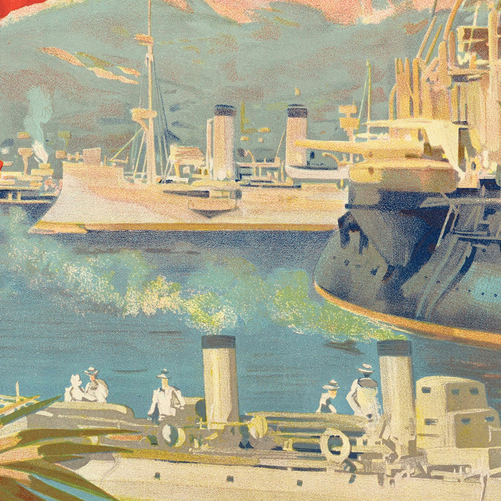 Toulon itself is France’s principal Mediterranean naval base, a natural deep-water harbor whose strategic role shaped the nation’s maritime story. In 1901, when this poster appeared, the city stood at the forefront of naval modernization. D’Alési’s narrative juxtaposition—an older wooden frigate set against contemporary steel vessels—speaks to a proud continuity: tradition informing progress. The fluttering flags, well-drilled figures on deck, and busy harbor reads like a visual salute to French seamanship and the city’s role as guardian of the coast.