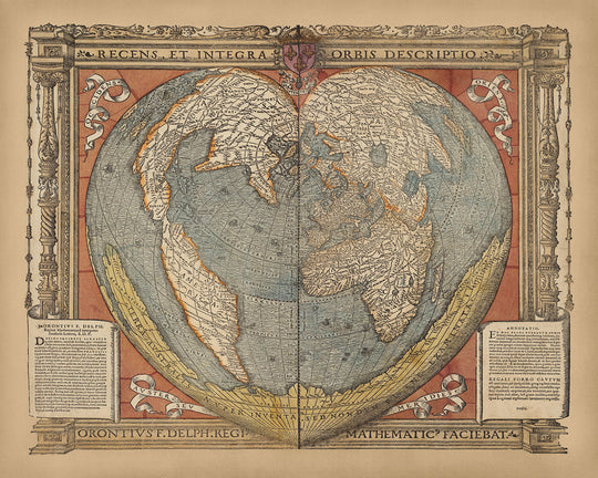 Old Heart-Shaped World Map by Fine, 1534: Cordiform Projection, Terra Australis, Latin Annotations
