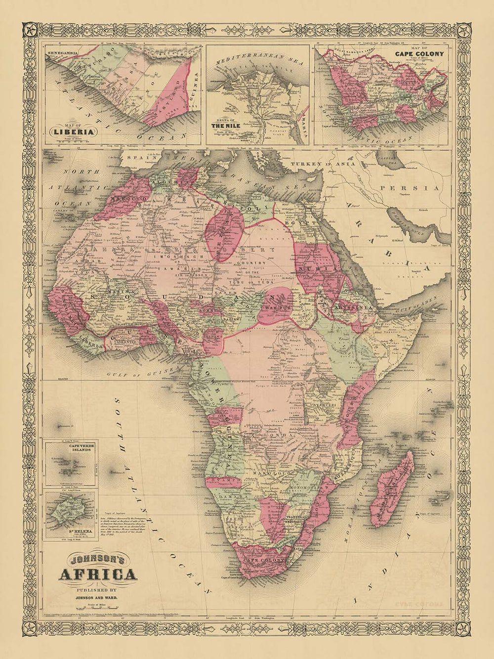 Step into the age of exploration with “Johnson’s Africa,” a masterwork of 19th-century cartography created in 1864 by the distinguished American mapmakers Alvin Jewett Johnson and Benjamin P. Ward. This evocative map, published at a time when Africa was a focal point of European exploration and colonial ambition, is a rare testament to the era’s geographical curiosity and artistic flair. Its original title, “Johnson’s Africa,” speaks to both its authoritative vision and the cartographic tradition of its creators, whose atlases graced the libraries of discerning scholars and adventurers alike.