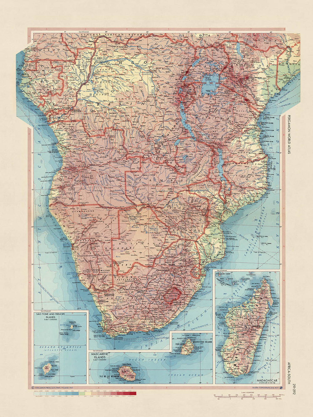 Lastly, the artistic style of the mapmaker is worth noting. The Polish Army Topography Service was renowned for its precision and accuracy, and this map is no exception. The careful delineation of political boundaries, the detailed rendering of physical features, and the thoughtful inclusion of insets all contribute to a map that is as aesthetically pleasing as it is informative. The projection of the map, a critical aspect of any cartographic work, is executed with precision, ensuring that the map is as accurate as possible. This commitment to accuracy and aesthetics makes the 'Africa - South' map a valuable addition to any collection.