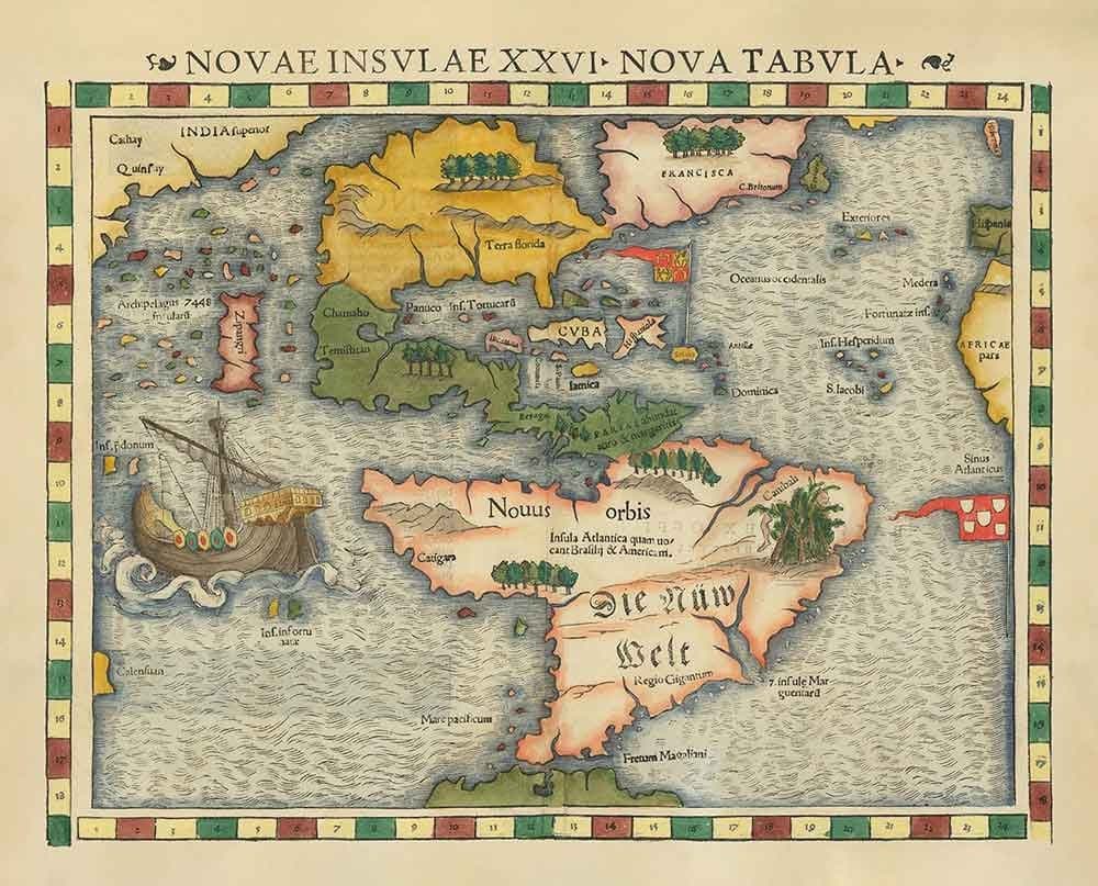 The first ever printed map of of the Americas, originally published in 1552 by Sebastian Munster in Basel, Switzerland. It's presented here in beautiful condition with a full latitude and longitude border and original handcolouring.