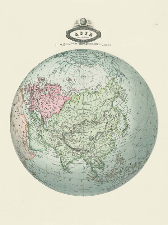 Step into the captivating world of 19th-century cartography with "Asie Spheroidale," a masterful creation by the esteemed mapmaker F.A. Garnier in 1860. This exquisite map places Asia at the heart of a uniquely projected hemisphere, offering a perspective that is both innovative and historically significant. Garnier's work is celebrated for its meticulous engraving and delicate coloring, qualities that are vividly displayed in this thematic world map. The map serves as a window into the past, capturing the geopolitical dynamics of a time when colonial powers were actively shaping the region.
