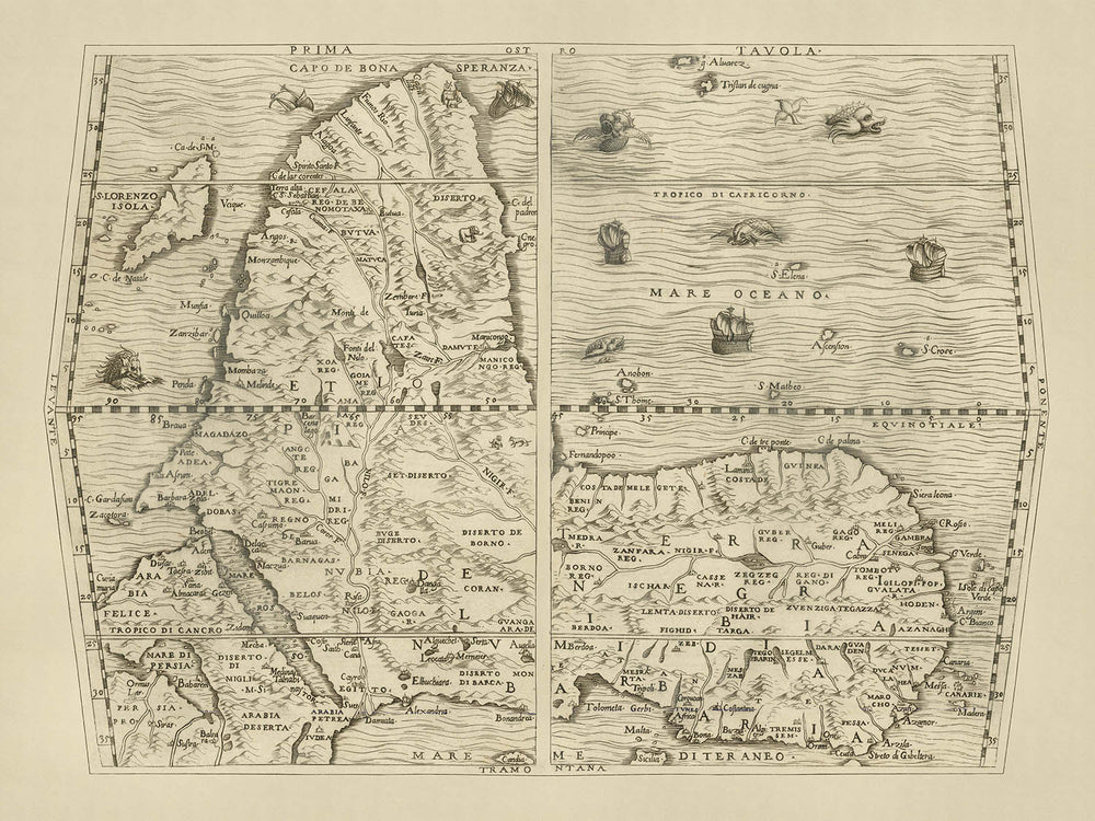 Discover the allure of exploration with the "Africa Prima Tavola," a captivating map crafted by the esteemed Venetian cartographer Giovanni Battista Ramusio in 1554. This remarkable piece is one of the earliest printed maps of Africa, offering a unique upside-down presentation of the continent. Drawing from the rich accounts of Arab geographers and the daring voyages of Portuguese explorers, Ramusio's map provides a window into the 16th-century understanding of Africa's vast and diverse landscapes.