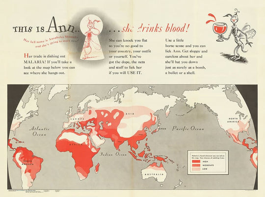 I bet you didn't know that Dr Seuss once made a world map... that's all about protecting US soldiers from malaria during World War 2. This map was originally published in 1943, at a time when malaria was causing more hospitalisations than battle casualties in some theatres.