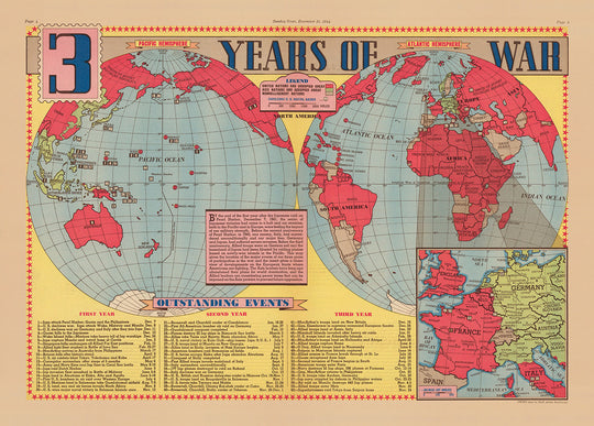 Old World War 2 Map, 1945: "3 Years of War" by Edwin Sundberg