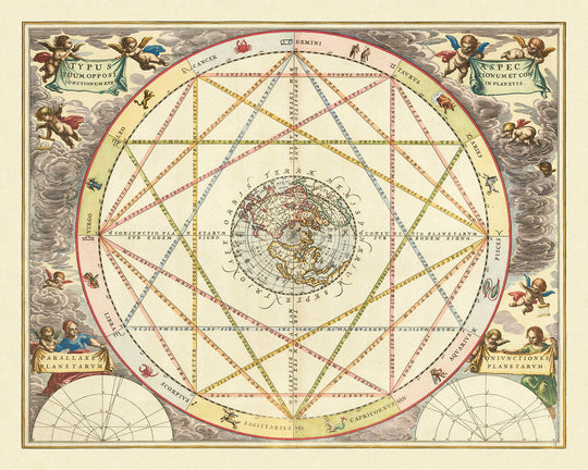 Step into the golden age of celestial cartography with Andreas Cellarius’ masterwork, "Typus Aspectuum Oppositionum Et Coniunctionum Etz In Planetis." Crafted in 1660 and later featured in the esteemed 1708 Valk & Schenk edition of the Harmonia Macrocosmica, this map elegantly fuses the realms of astronomy and astrology, offering a rare glimpse into the intellectual and artistic ambitions of the 17th century. The map’s original Latin title signals its thematic depth: a study of planetary aspects, oppositions, and conjunctions, beautifully illustrated through the interplay of zodiacal symbols and the mapped heavens.
