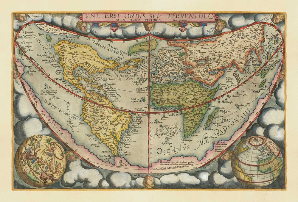 This is one of the first maps to show North America as a separate land mass from Asia (though the northern shoreline is totally unknown), and if you look closely you can see some early colonial discoveries in the Atlantic and Pacific. Antarctica and the peninsula of Tierra del Fuego near modern-day Argentina are entirely speculative at this point - and on this cordiform projection, seem to wrap around the world.