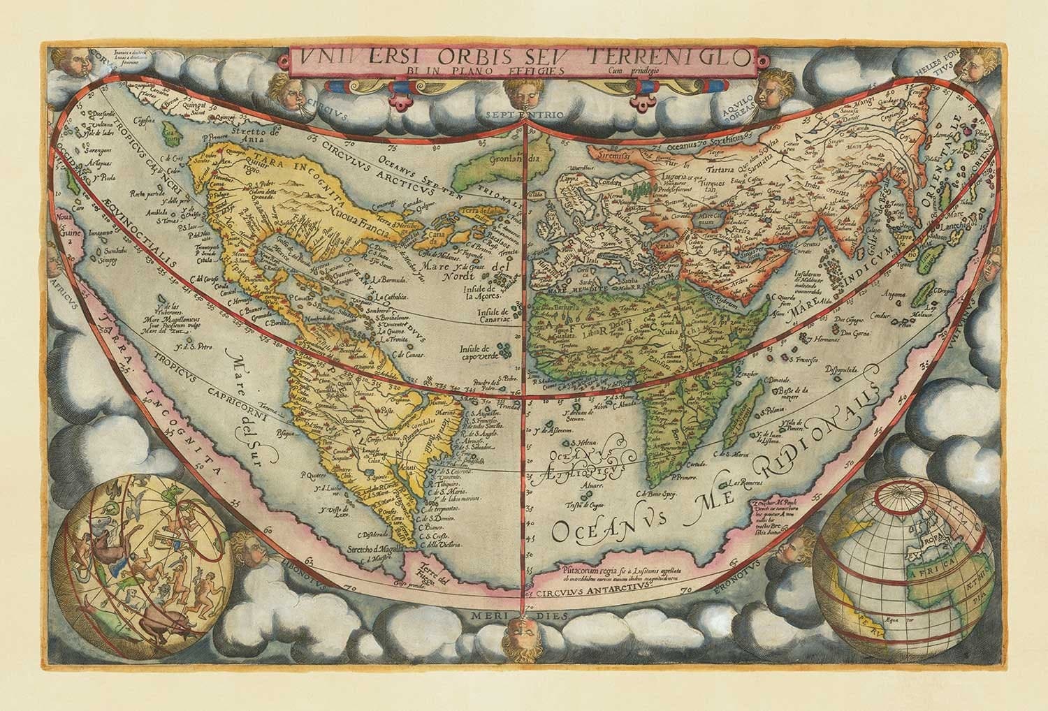 Beyond its odd projection, which does a reasonable job of portraying the true size of each continent, this map is a beautiful piece of 16th century cartography, with an incredible amount of detail and so many cherubic wind heads blowing the clouds!