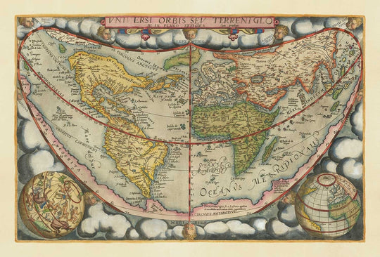 An extremely rare and unusual world map by Gerard de Jode, originally published and handcoloured in 1571 - and as such, it's one of the first world maps ever produced. The most striking thing about this map, of course, is its cordiform projection - literally, heart-shaped projection.