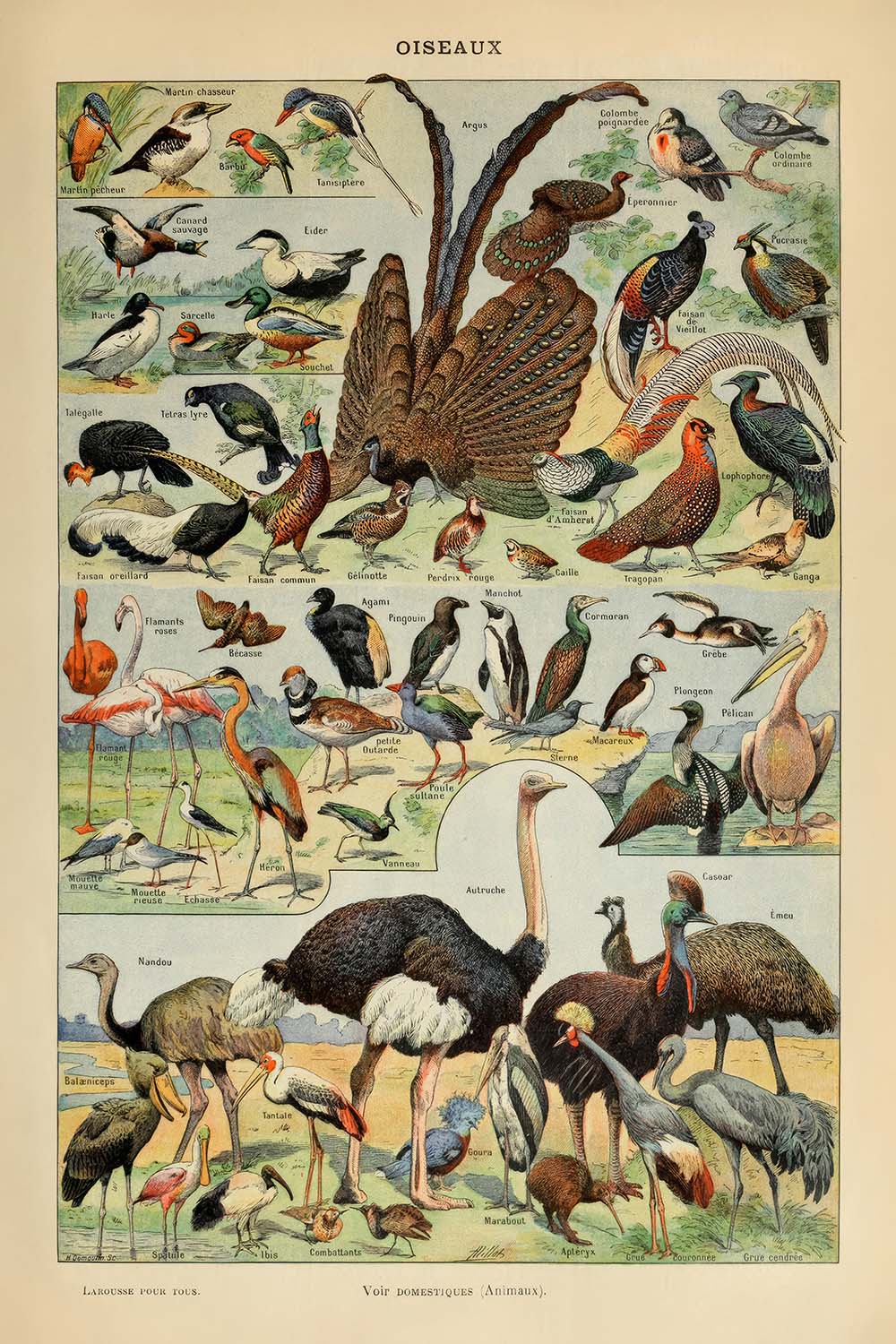Vögel (1) von Adolphe Millot, 1890 - Geflügel, Flamingo, Meeresvögel, flugunfähige Vögel