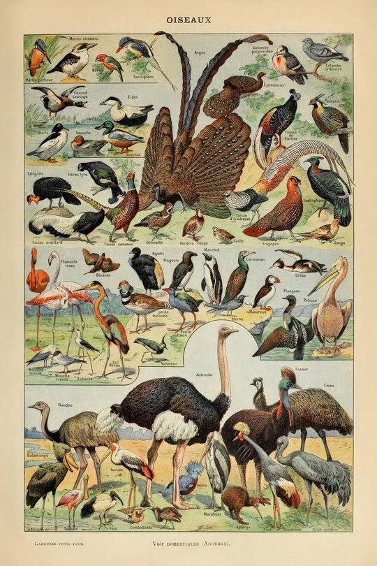 Vögel (1) von Adolphe Millot ist eine fesselnde zoologische Illustration aus der viktorianischen Ära, die 1890 erstellt wurde und eine Vielzahl von Vogelarten exquisit darstellt. Dieses Kunstwerk wurde ursprünglich in der berühmten französischen Enzyklopädie "Le Larousse pour tous: nouveau dictionnaire encyclopédique" veröffentlicht. Adolphe Philippe Millot war nicht nur ein ausgezeichneter französischer Künstler – ein Maler, Lithograf und Mitglied des Salon des Artistes Francaise – sondern auch ein renommierter Entomologe. Dieses bemerkenswerte Stück zeichnet sich durch seine wissenschaftliche Genauigkeit und reiche Kunstfertigkeit aus, indem es zoologisch korrekte Darstellungen zahlreicher Vogelarten präsentiert, wobei jedes Exemplar in eleganter französischer Schrift deutlich beschriftet ist.