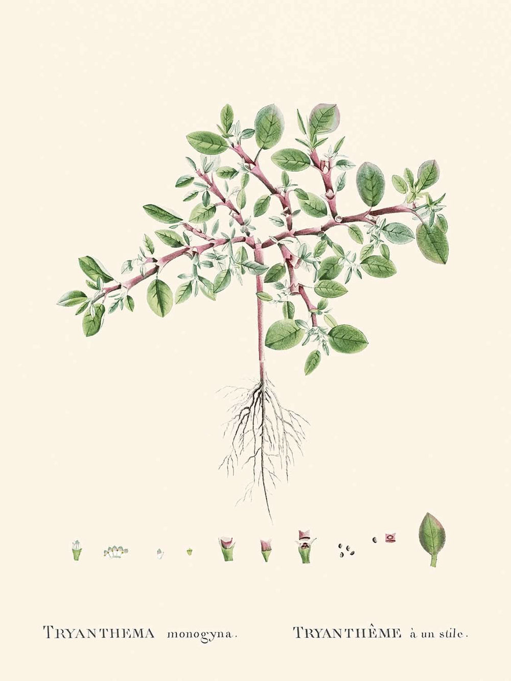Desert Horsepurslane, ursprünglich Trianthema Monogyna genannt, wurde erstmals 1802 veröffentlicht. Diese exquisite botanische Illustration im viktorianischen Stil ist das Werk von Pierre-Joseph Redouté, einem der berühmtesten botanischen Illustratoren der Geschichte. Der in Belgien geborene Redouté hatte schon früh künstlerischen Erfolg als Mallehrer von Marie Antoinette. Später widmete er auf Wunsch von Josephine Bonaparte, der Frau von General Napoléon, einen Großteil seines Lebens der Blumenmalerei von Château de Malmaison. Sein Engagement für die botanische Kunst führte dazu, dass er eine reiche Produktion von über 2.100 botanischen Gemälden erreichte, in denen er mehr als 1.800 verschiedene Arten dokumentierte.