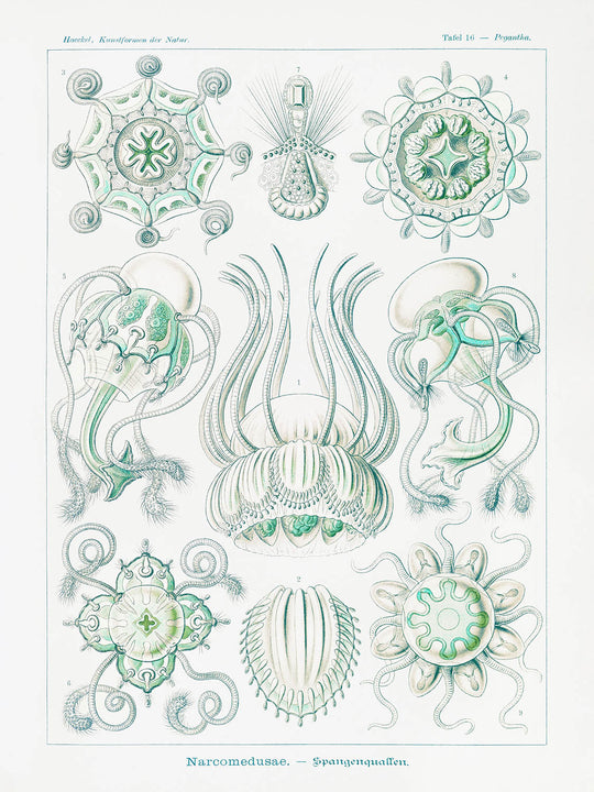 Narcomedusae Spangenquallen (Tafel 16) ist eine faszinierende wissenschaftliche Illustration von Ernst Haeckel, die ursprünglich 1904 im Rahmen seines berühmten Werkes "Kunstformen der Natur" veröffentlicht wurde. Dieses besondere Kunstwerk zeigt verschiedene Arten von Quallen, die detailliert dargestellt sind und Haeckels tiefe Bewunderung für die natürliche Welt widerspiegeln.