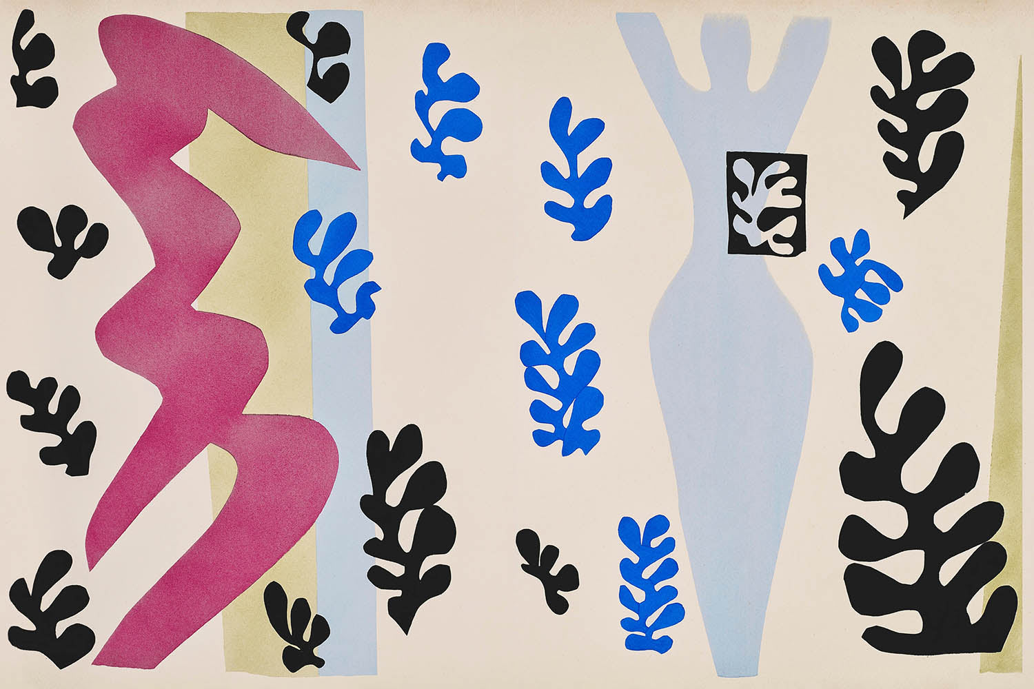 Das Kunstwerk ist bemerkenswert für seine ausgefallene Farbpalette, die von lebhaften Rosatönen, harmonischen Blautönen und auffälligen Schwarz dominiert wird. Matisse zeigt sein Talent, Emotionen und Bewegung hervorzurufen, indem er ausgeschnittene Formen verwendet, die traditionelle Definitionen von Raum und Linie überschreiten. Dieses einzigartige ästhetische Erlebnis unterstreicht, warum der Besitz eines Drucks dieses Kunstwerks jede Sammlung bereichern würde.