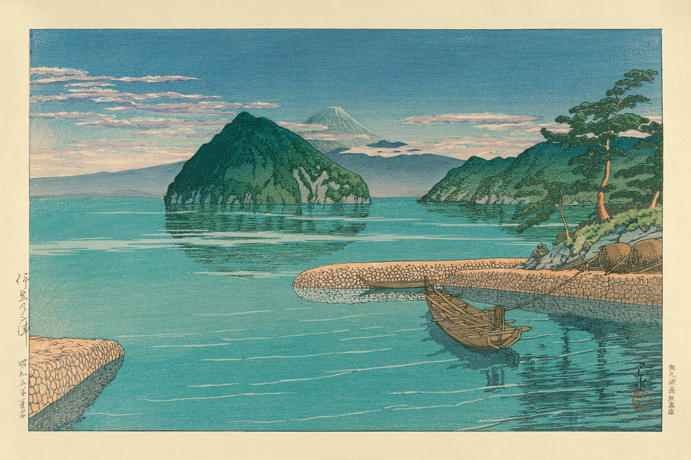 „Mito, Izu und Mt. Fuji“ von Hasui Kawase ist ein atemberaubender Holzschnitt, der 1935 geschaffen wurde und die ruhige Schönheit sowie die komplexe Kunstfertigkeit widerspiegelt, für die Kawase bekannt ist. Als bemerkenswerte Figur der Shin-Hanga-Bewegung revitalisierte Kawase geschickt die traditionelle Ukiyo-e-Kunst mit einer Mischung aus westlichen Elementen und fängt ruhige Landschaften mit bemerkenswerter Detailgenauigkeit und emotionaler Tiefe ein.