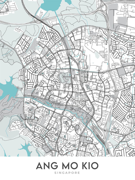 Ang Mo Kio, ein lebendiges und geschäftiges Viertel im Herzen von Singapur, wird auf dieser modernen Karte von The Unique Maps Co. hervorragend eingefangen. Diese Karte konzentriert sich auf die Feinheiten des Straßenverlaufs und der öffentlichen Plätze von Ang Mo Kio und bietet eine klare, unbeschriftete Ästhetik, die die moderne Stadtlandschaft betont. Die Region ist berühmt für ihre harmonische Mischung aus Wohngebieten, Handelszentren und üppigen Grünflächen, was sie zu einem faszinierenden Motiv für eine dekorative Karte macht. Das Fehlen von Beschriftungen lädt den Betrachter ein, die visuellen Texturen und Muster zu erkunden, die durch die Straßen und Sehenswürdigkeiten gebildet werden, und verwandelt eine einfache Karte in ein faszinierendes visuelles Puzzle eines der beliebtesten Viertel Singapurs.