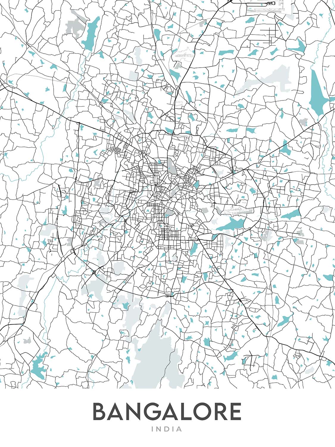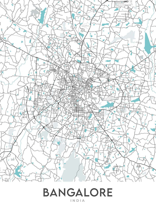 Zusätzlich zu ihrem visuellen Reiz dient diese Karte auch als Hommage an die reiche kulturelle und geografische Landschaft Bangalores. Ikonische Wahrzeichen wie der Lalbagh Botanische Garten, der Cubbon Park und der Bangalore Palace sind subtil dargestellt und vermitteln ein Gefühl von Ort und Geschichte, ohne den Betrachter zu überwältigen. Die Karte umfasst auch bedeutende Gewässer wie den Ulsoor-See und fügt der urbanen Umgebung ein natürliches Element hinzu. Diese Merkmale machen die Karte nicht nur zu einem schönen Kunstwerk, sondern auch zu einem bedeutungsvollen, das das Wesen Bangalores auf einzigartige und stilvolle Weise einfängt.
