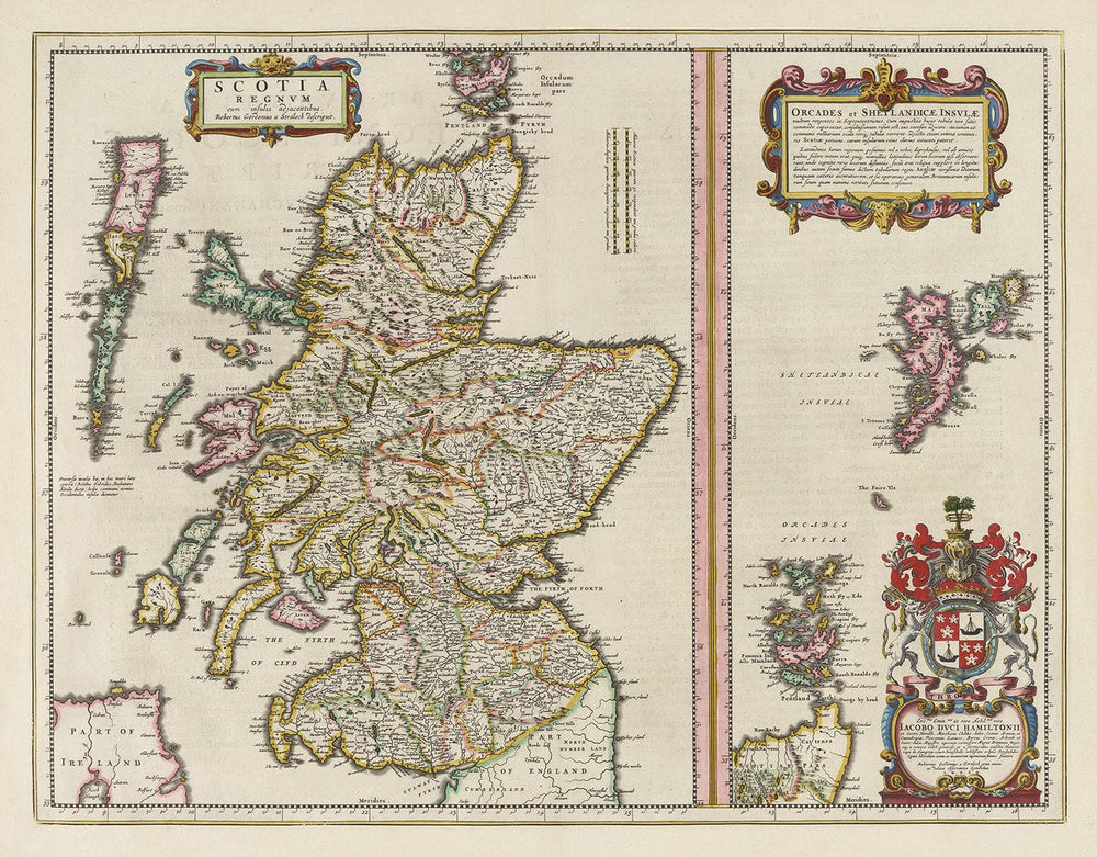 Dies ist eine äußerst seltene, alte farbige Karte von Schottland, einschließlich der Shetlandinseln und Orkney, erstellt von dem Meisterkartenmacher Jean Blaeu aus seiner Werkstatt in Amsterdam und ursprünglich 1654 in diesem Theatrum Orbis Terrarum Sive Atlas Novus veröffentlicht. Diese alte Karte besteht im Wesentlichen aus zwei Tafeln: Schottland links und die Shetlandinseln sowie Orkney rechts.