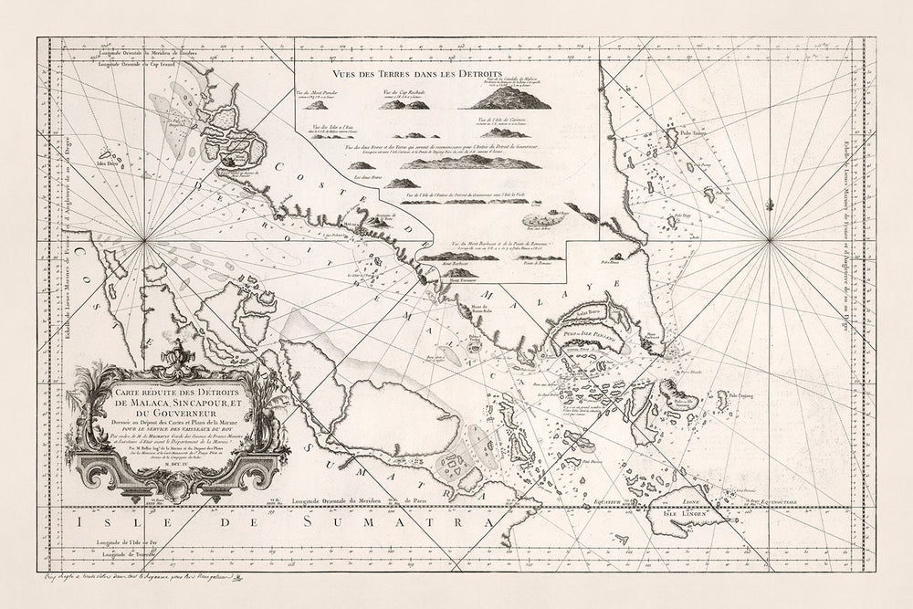 Zusammenfassend ist 'Carte Reduite des Detroits de Malaca, Sincapour, et du Gouverneur' eine historisch informative Karte, die wertvolle Einblicke in die maritime Geschichte Südostasiens und die kartografischen Praktiken des 18. Jahrhunderts bietet. Sie steht als Beweis für Jacques Bellins Können und die anhaltende Anziehungskraft von Seekarten. Ob als historisches Artefakt, Kunstwerk oder Navigationswerkzeug betrachtet, ist diese Karte eine wertvolle Ergänzung jeder Sammlung.