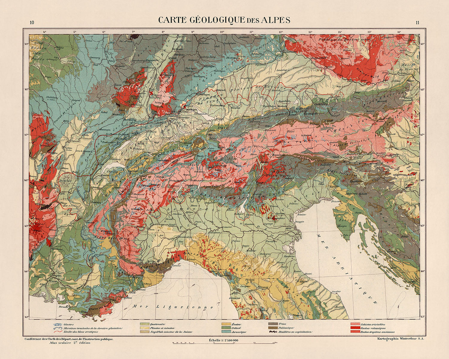 Kartographia Winterthur, der Herausgeber dieser Karte, ist für ihr Engagement für Genauigkeit und Detailgenauigkeit bekannt. Ihr Fachwissen auf dem Gebiet der Kartographie wird in der „Carte geologuique des Alpes“ deutlich. Die Karte ist ein Beweis ihres Könnens und Engagements und bietet eine Fülle von Informationen über die Geologie der Alpen sowie die politische und physische Landschaft der Länder, die das Gebirge durchquert. Diese Karte ist nicht nur ein Hilfsmittel zum Verständnis der Geographie des Alpenraums, sondern auch ein Kunstwerk, das die Leidenschaft des Herausgebers für Kartographie widerspiegelt.