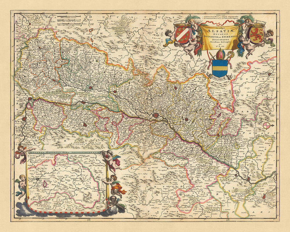 Tauchen Sie ein in die historischen Feinheiten von „Utriusque Alsatiae, Ducatus Dupontii et Spirensis Episcopatus“, einer bemerkenswerten Karte, die 1690 von Nicolaes Visscher II. angefertigt wurde. Dieses Meisterwerk der Kartographie erfasst die Regionen und politischen Teilungen des Elsass sowie des Herzogtums Zweibrücken und des Bistums Speyer , Gebiete, die heute zum heutigen Frankreich und Deutschland gehören. Der vollständige Name der Karte bedeutet „Beide Elsass, Herzogtum Zweibrücken und Bistum Speyer“ und vermittelt ein klares Verständnis der von ihr umfassten Gebiete.