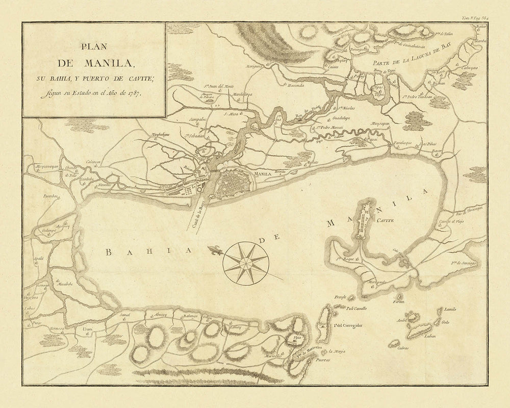Manila, eine Stadt voller Geschichte und Kultur, wird wunderschön zusammen mit ihrer geschäftigen Bucht und dem strategischen Hafen von Cavite dargestellt. Die Karte hebt bedeutende Wahrzeichen und Befestigungen hervor und bietet einen Einblick in die Vergangenheit der Stadt als Zentrum des Handels und kolonialen Einflusses. Die filigranen Details fangen das Wesen der urbanen Landschaft Manilas ein und zeigen ihre Bedeutung als Handels- und Regierungszentrum im späten 18. Jahrhundert.