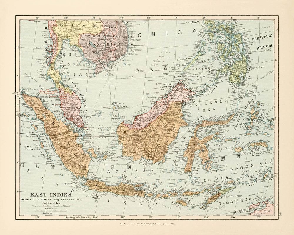 Die Karte der "Ostindien", die 1926 von dem renommierten Edward Stanford Ltd. erstellt wurde, bietet einen faszinierenden Einblick in die geopolitischen und geografischen Landschaften Südostasiens zu Beginn des 20. Jahrhunderts. Diese Karte, Teil von Stanfords prestigeträchtigem Londoner Atlas der allgemeinen Geographie, spiegelt das sorgfältige Handwerk und die kartografische Expertise wider, für die Edward Stanford Ltd. bekannt war. Die Karte zeichnet die politischen Grenzen der damaligen Zeit schön nach und bietet einen historischen Schnappschuss von Regionen, die das heutige Indonesien, Malaysia, Brunei, Singapur, Timor-Leste und die Philippinen sowie Teile von Thailand, Kambodscha und Vietnam umfassen.