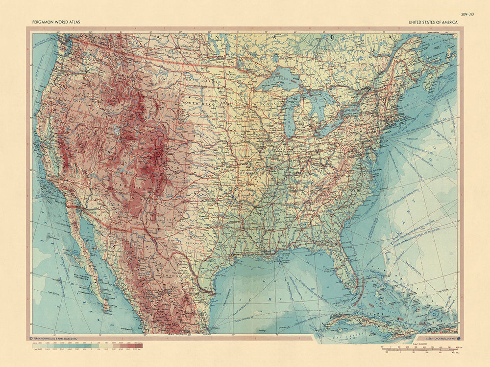 Die Karte der 'Vereinigten Staaten von Amerika', die 1967 vom polnischen Armeetopografiedienst sorgfältig erstellt wurde, bietet eine detaillierte politische und physische Darstellung des Landes. Diese nationale Landkarte zeichnet sich durch ihre umfassende Abdeckung der Vereinigten Staaten aus, die sich von etwa dem 50. nördlichen Breitengrad im Norden bis zum 25. nördlichen Breitengrad im Süden erstreckt. Dieser Bereich umfasst nicht nur das gesamte Gebiet der Vereinigten Staaten, sondern auch bedeutende Teile von Kanada, Mexiko, Kuba und den Bahamas. Die reichhaltigen Details und die präzise Kartographie der Karte bieten eine einzigartige Perspektive auf die geopolitische Landschaft des mittleren 20. Jahrhunderts.