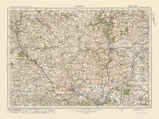 Diese alte Ordnance Survey-Karte, Blatt 128 – Tiverton, aus der 1925 erschienenen One-Zoll-Ausgabe „Popular“ für England und Wales, ist ein fesselndes Stück Geschichte, das einen Einblick in die Vergangenheit bietet. Die Karte zeigt verschiedene Städte und interessante Orte in der Region, darunter Tiverton, Crediton, Cullompton, Bampton, Willand und North Tawton. Es bietet eine einzigartige Gelegenheit, die Landschaft und Siedlungen der Region so zu erkunden, wie sie vor fast einem Jahrhundert waren.