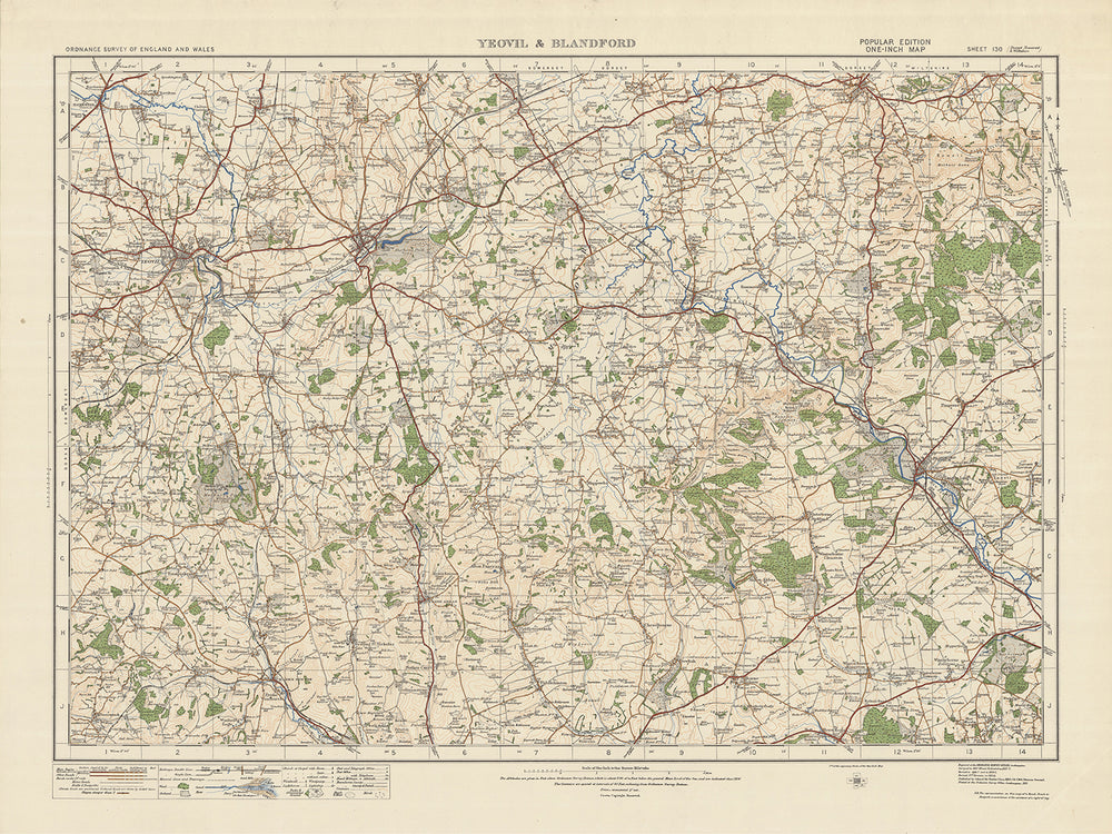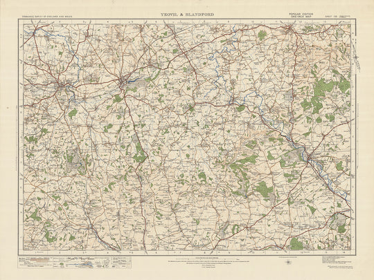 Diese sorgfältig gestaltete Reproduktion der 1-Zoll-Karte „Popular“ des Ordnance Survey, Blatt 130 – Yeovil & Blandford, aus dem Jahr 1925 bietet einen faszinierenden Einblick in die Vergangenheit. Die Karte zeigt die historische Grafschaft Dorset in England und Wales mit bedeutenden Städten wie Sherborne, Shaftesbury, Ilchester, Maiden Newton und dem malerischen Dorset Area of Outstanding Natural Beauty (AONB).