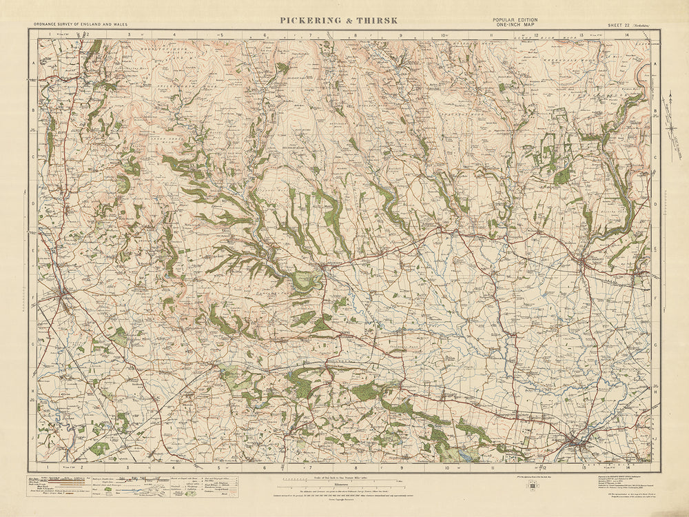 Diese akribisch detaillierte und wunderschön erhaltene Karte mit dem Titel "Blatt 22 - Pickering & Thirsk" ist Teil der renommierten Ordnance Survey's One-inch "Popular"-Ausgabe, England und Wales, veröffentlicht im Jahr 1925. Diese Karte bietet einen faszinierenden Einblick in die Vergangenheit und enthält eine Fülle von Informationen über die Geografie, die Siedlungen und die Sehenswürdigkeiten der Region.