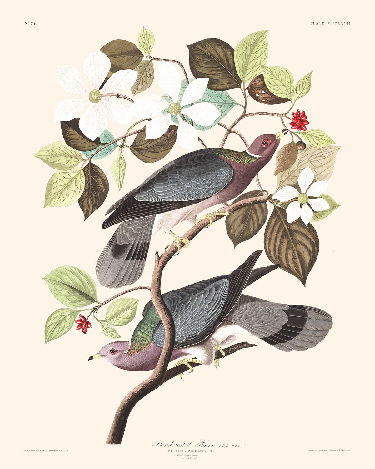 Die Verwendung von Farbe in diesem Kunstwerk ist bemerkenswert. Die Tauben zeigen Farbtöne von leicht rötlich-lila, graublau und metallisch grün, mit zarten Mustern und detailliertem Gefieder. Die Komposition, die die Vögel auf einem kunstvoll illustrierten Zweig zeigt, schafft ein Gefühl von natürlicher Harmonie und Eleganz. Audubons Fähigkeit, wissenschaftliche Genauigkeit mit ästhetischer Schönheit zu verbinden, macht sein Werk zeitlos und ansprechend.