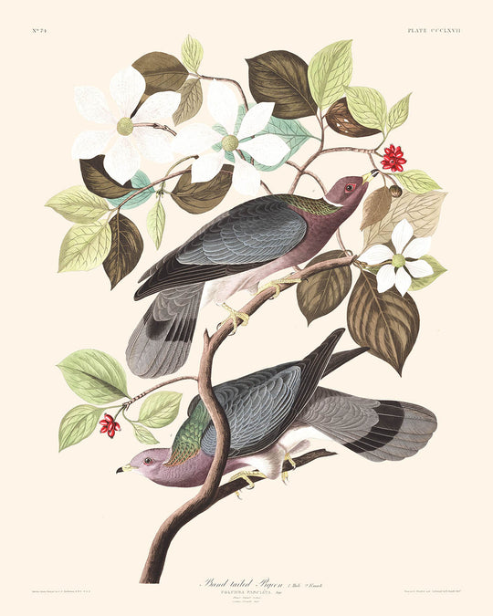 Band-tailed Pigeon (Tafel 367), erstmals veröffentlicht im Jahr 1827, ist eine großartige Illustration von John James Audubon, die in seinem monumentalen Werk The Birds of America zu finden ist. Dieses exquisite Kunstwerk zeigt zwei adulte Band-tailed Pigeons, die prächtig in ihrem natürlichen Lebensraum auf einem Zweig des Nuttall's Dogwood dargestellt sind. Die lebendigen Details und leuchtenden Farben fangen das Wesen dieser Vögel ein und betonen ihre Schönheit und Anmut.