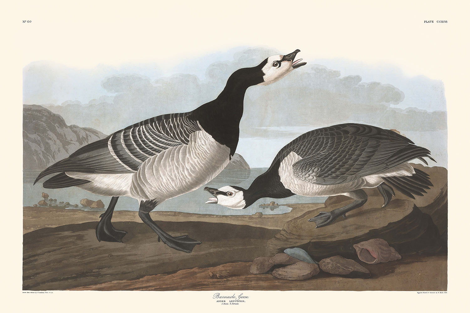 Die Bernikla selbst ist bemerkenswert für ihr auffälliges schwarz-weißes Gefieder und die kontrastierenden dunkleren Muster. Audubons Verwendung von reichen, natürlichen Farbtönen und komplizierten Federtexturen erweckt den Vogel zum Leben. Die Landschaftshintergründe in seinen Werken sind ebenso atemberaubend und bieten einen authentischen Einblick in den natürlichen Lebensraum des Vogels. Diese spezielle Illustration ist für ihre Seltenheit in Nordamerika bekannt, was die Migrationsmuster des Vogels und die historische Bedeutung seines Auftretens betont.