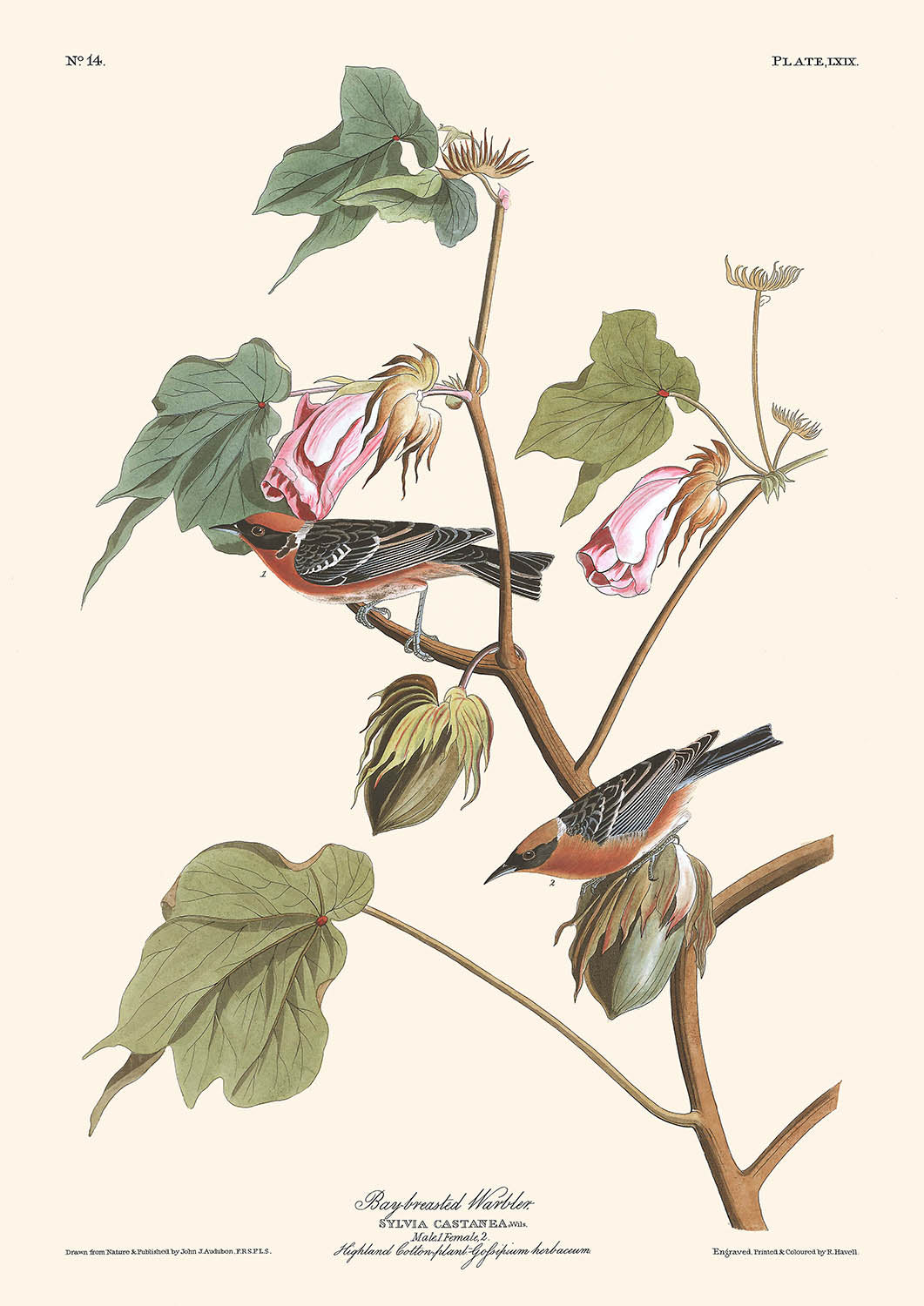 Der Bay-breasted Warbler selbst ist ein faszinierendes Sujet. Audubon dokumentierte, wie er nur kurz durch die Vereinigten Staaten migriert, mit Sichtungen in verschiedenen Bundesstaaten von Pennsylvania bis Louisiana. Der männliche Bay-breasted Warbler zeichnet sich durch seinen kastanienbraunen Kopf und Vorderhals aus, mit auffälligen schwarzen und gelblich-weißen Akzenten, die ihn zu einem visuellen Genuss für jeden Vogelenthusiasten machen.
