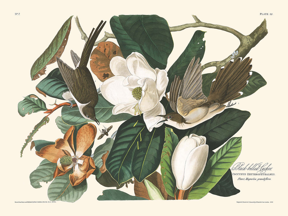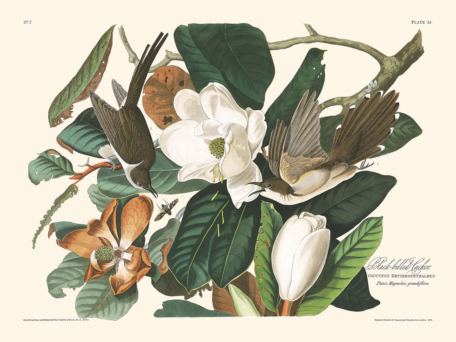 Der Schwarzbillige Kuckuck ist durch seine subtile Färbung und seine Habitatpräferenzen gekennzeichnet, wobei er die bewaldeten Ränder von Gewässern den Tiefen der Wälder vorzieht. Audubons Darstellung dieses Vogels, der anmutig auf einem Magnolienzweig sitzt, zeigt sein außergewöhnliches Talent, komplexe Details und lebensechte Texturen darzustellen, wodurch jedes Element der Szene zum Leben erwacht.