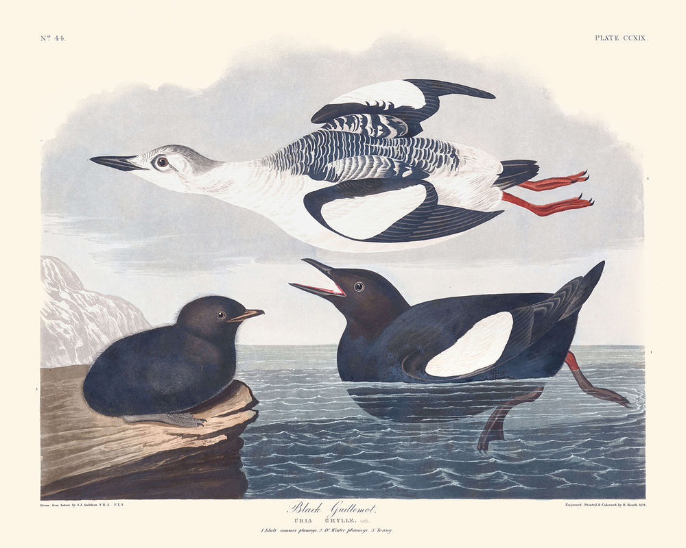 Mit seinen tiefen Schwarz- und Grüntönen sowie lebhaften roten Akzenten verkörpert die Illustration der Schwarzen Tauchergans Audubons Talent, Farbe und Detail einzufangen. Egal, ob Sie ein Kunstliebhaber, ein Vogelenthusiast oder jemand sind, der historische Kunstwerke schätzt, dieses Stück verleiht jedem Raum einen Hauch von verfeinerter Natur.