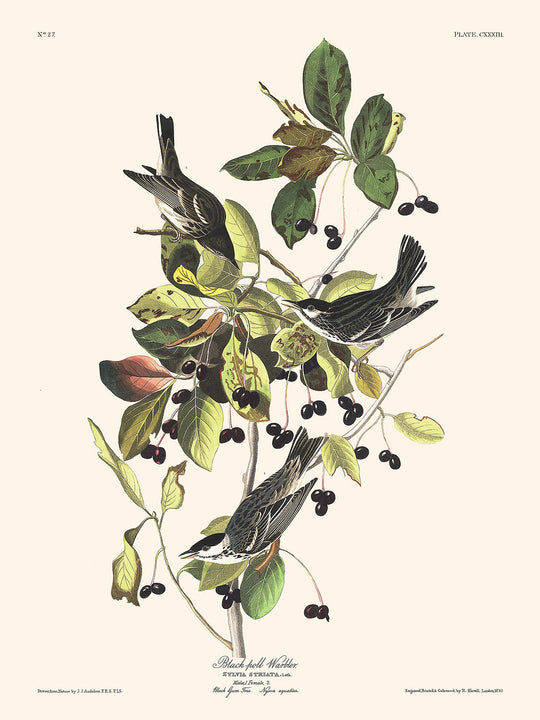 Der Schwarzpoll-Waldsänger (Tafel 133), erstmals veröffentlicht im Jahr 1827, ist eine auffällige Illustration des renommierten Ornithologen und Malers John James Audubon. Dieses wunderschöne Kunstwerk ist Teil von Audubons Hauptwerk, "Die Vögel Amerikas", einer monumentalen Sammlung, die die Vielfalt und Schönheit der amerikanischen Vogelarten zeigt.