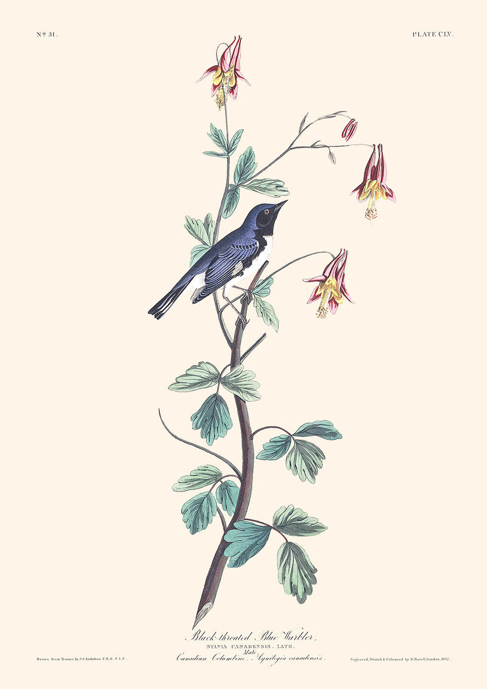 Die Illustration des Schwarzkehl-Blauwarblers ist bemerkenswert für ihre genaue Darstellung und lebendigen Farben, die das auffällige blaue und schwarze Gefieder des Männchens und die zurückhaltenderen Töne des Weibchens gekonnt porträtiert. Audubons akribische Liebe zum Detail und seine Leidenschaft für Vögel sind in dieser exquisiten Illustration offensichtlich.