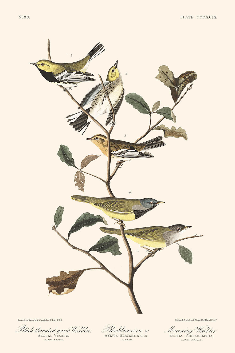 Schwarzkehl-Grünwaldsänger, Blackburnsänger, Trauermönchsänger von John James Audubon, 1827